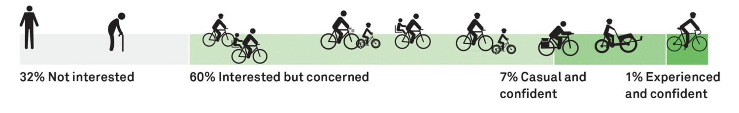 Many people are interested in cycling but are dissuaded by stressful interactions with motor vehicles. These potential cyclists, defined as “interested but concerned,” account for a majority of the population and vary by age and cycling ability.2 Experienced and casual cyclists are more traffic tolerant, but they account for a significantly smaller share of the population.
