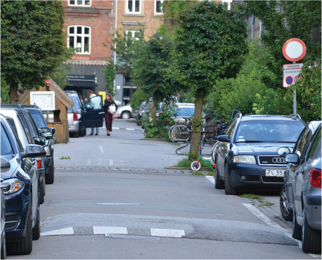 A strategy of filtered permeability or area-wide metering can be used to prevent all streets from becoming through-streets. Through-moving vehicles can be encouraged to divert from a street at successive nodes, creating good access conditions for motor vehicles without permitting high vehicular volumes in sensitive portions of the street. Using street direction changes and diversions to discourage some through movement, and encouraging the use of less-sensitive routes through wayfinding and lane continuity can allow for the creation of successful neighborhood-scale shared street networks and slow zones.