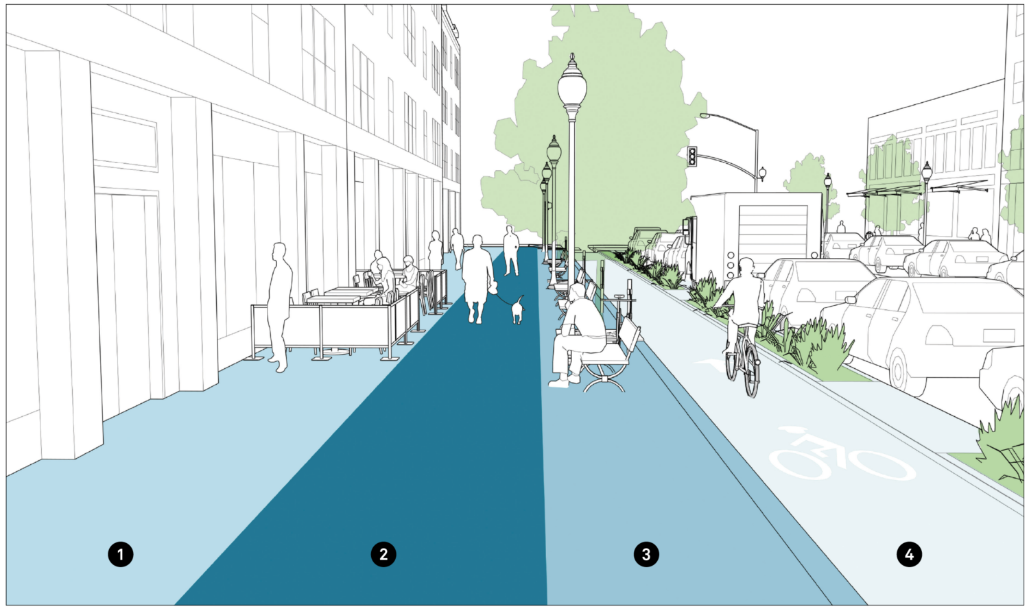 The enhancement or buffer zone is defined as the space immediately next to the sidewalk, and may consist of a variety of different elements. These include curb extensions, parklets, stormwater management features, parking, cycle racks, cycle share stations, and curbside cycle tracks.