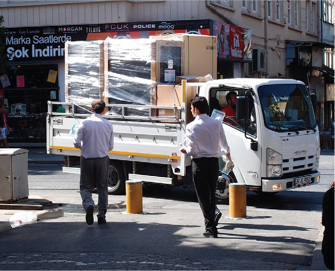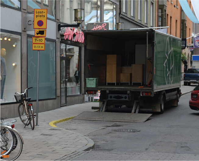 Many commercial locations in urban areas require frequent delivery and pick-up services. These areas present conflicts between high pedestrian volumes and large delivery trucks. Designate urban areas where goods may be transferred from large vehicles to smaller vehicles appropriate for the scale of city streets.