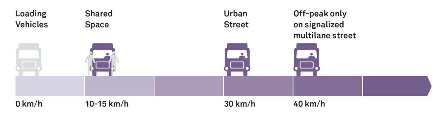 Because of their mass, large vehicles and trucks speeds should be limited to 30 km/h in urban streets and never exceed 40 km/h. Urban streets should be designed to support a maximum of 40 km/h and turning radii that allow slow turns. See: Corner Radii.