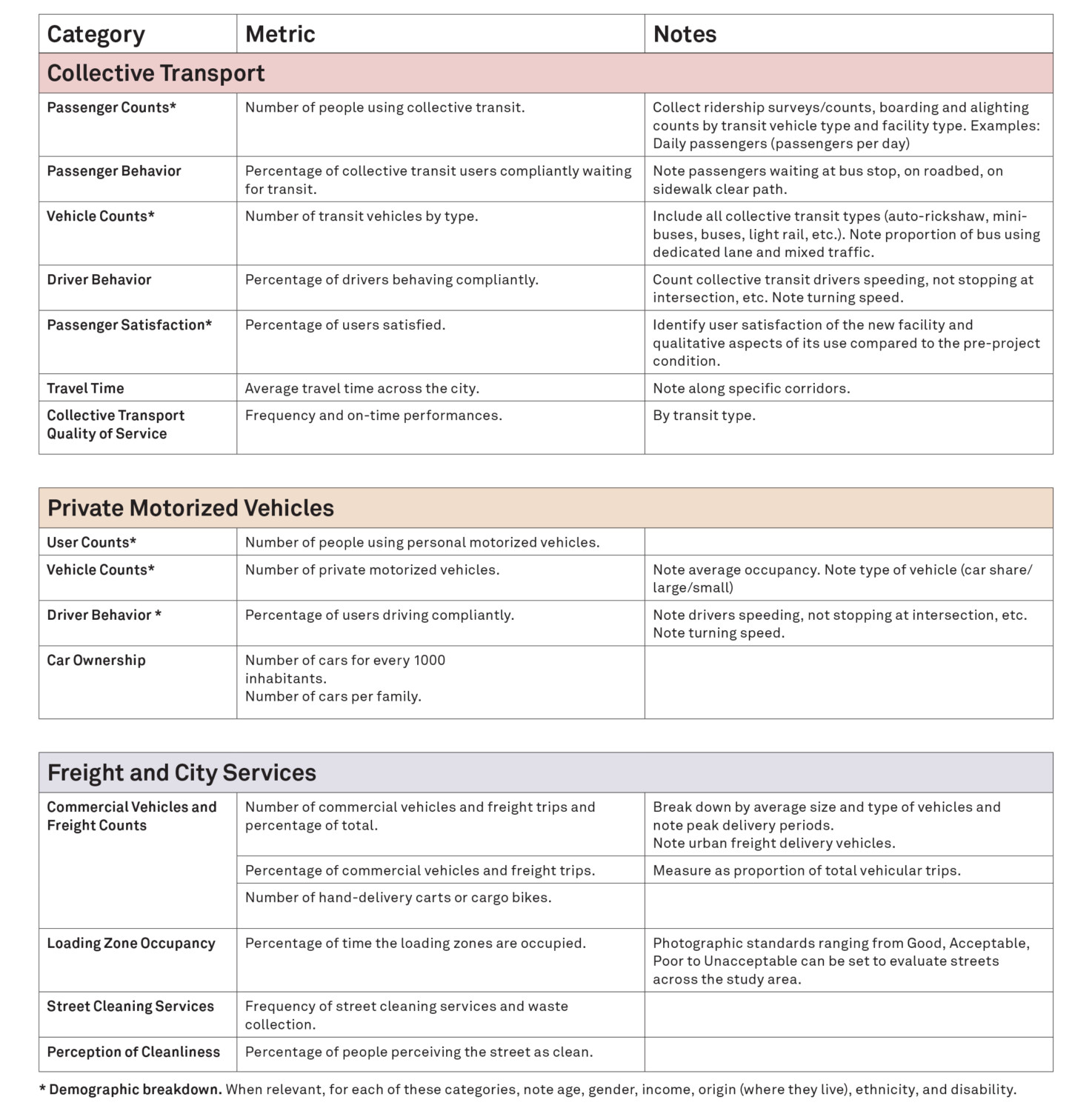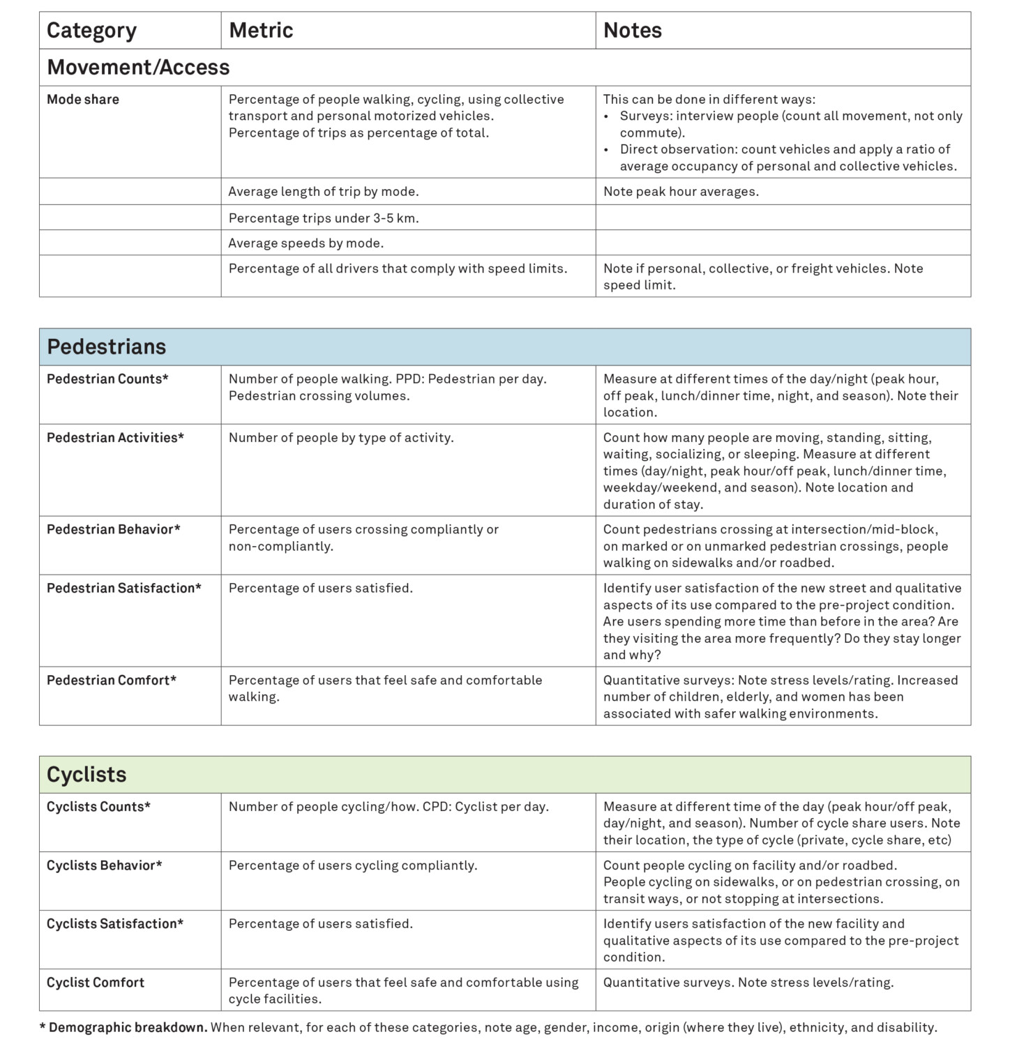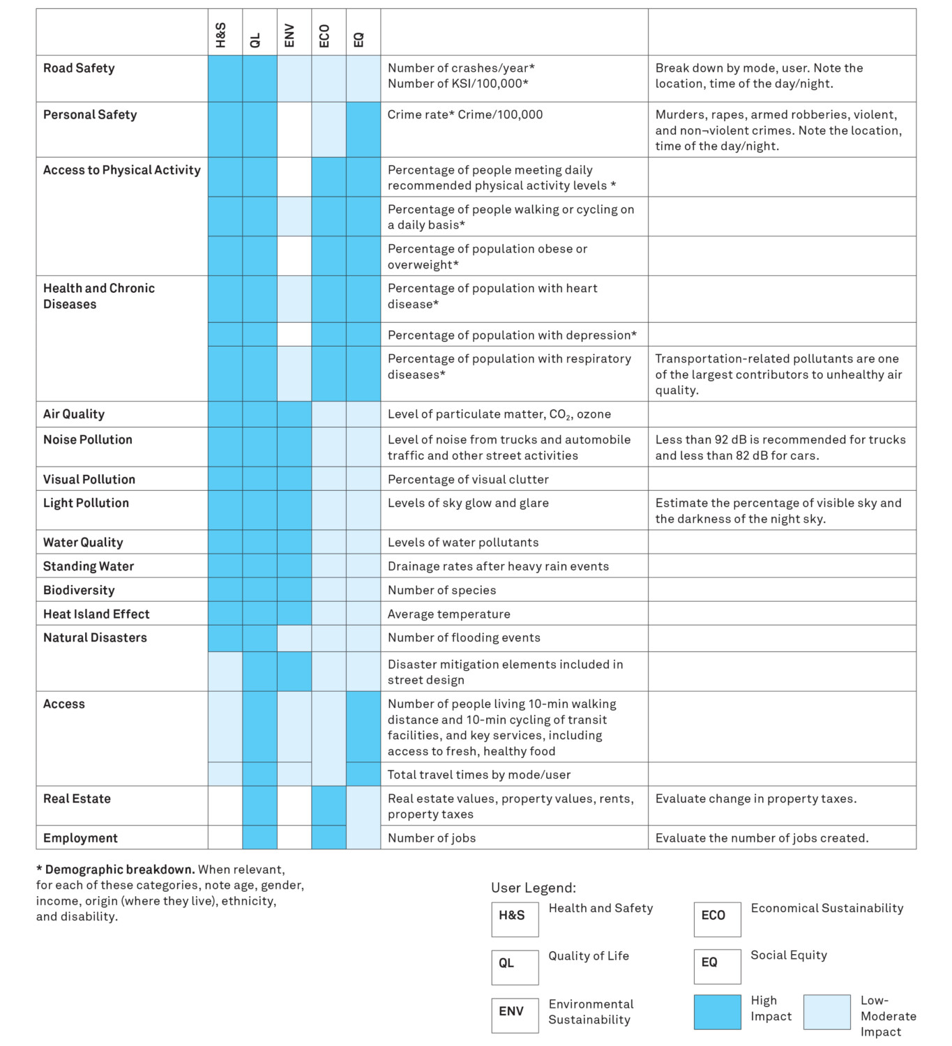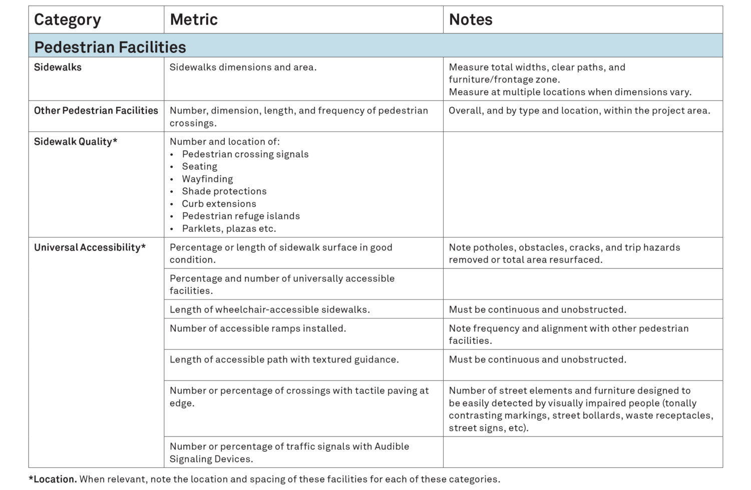 Use the following tables to identify relevant metrics to evaluate your project and goals. These tables are a supplement to chapter 3: Measuring and Evaluating Streets and should be understood in conjunction with it. Measure the changes before and after the project, or over time, to generate data indicating a change in