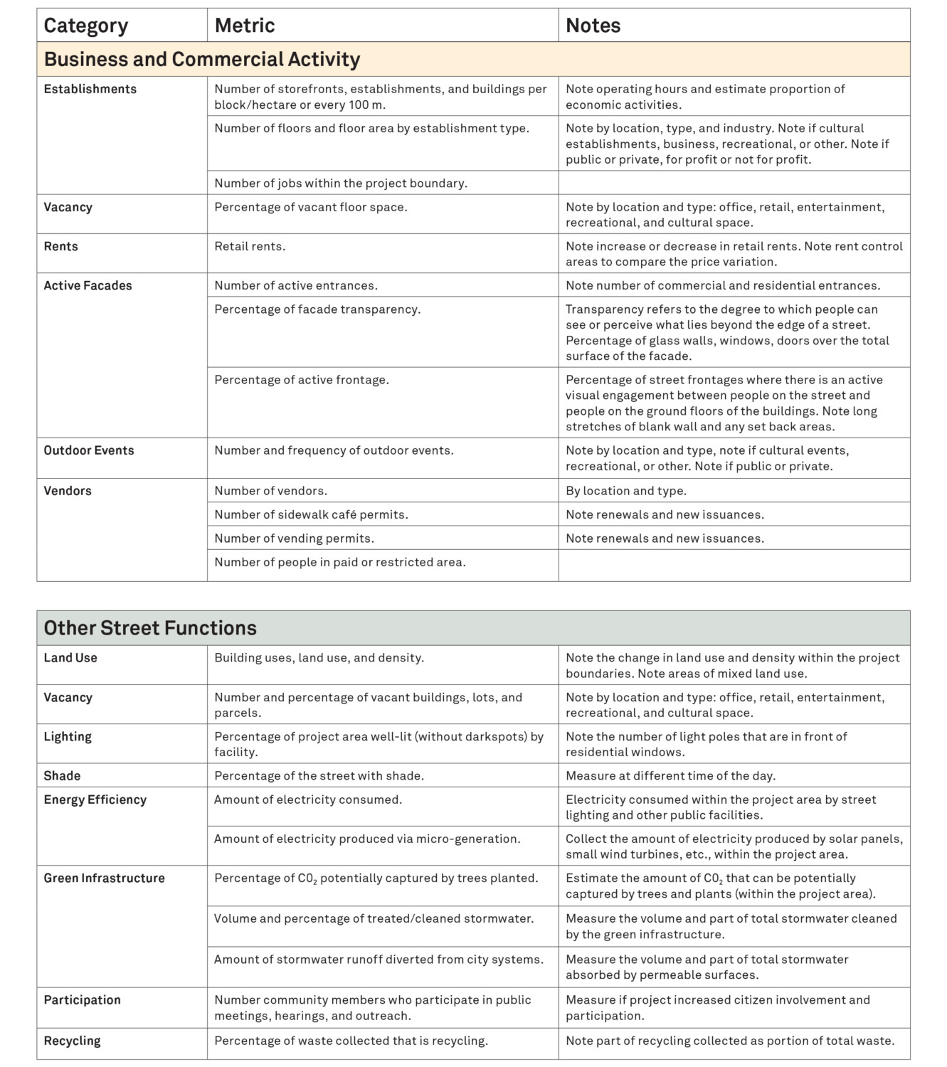These metrics help document and evaluate the physical changes in street conditions, and the resultant operational shifts, in order to understand the impact of a particular project.