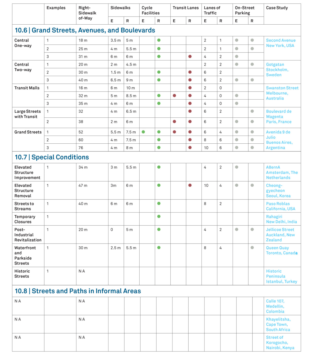 The chart below provides a summary of the types of streets presented in chapter 10: Streets; their overall dimensions, some basic information on space allocation among users, and the case studies explored. They are not a mandated set of dimensions, but rather examples of the various ways existing streets can be transformed.