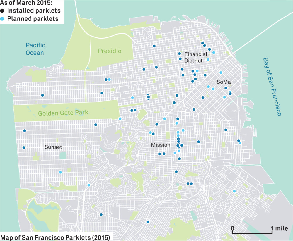 Extent: 65 parklets installed citywide; 7 street plazas installed citywide