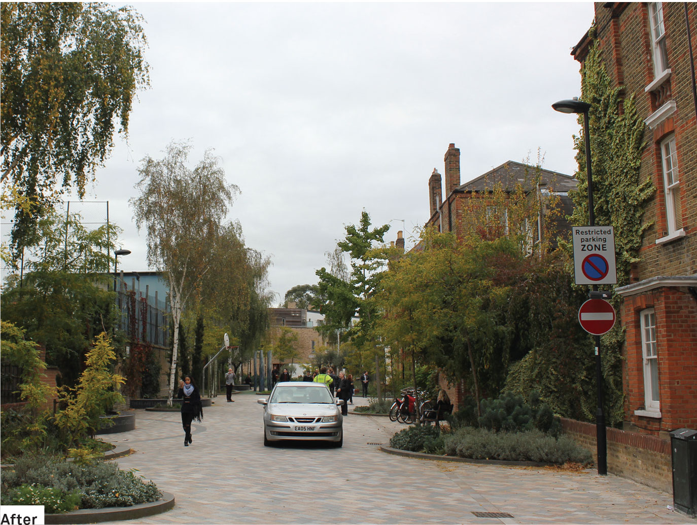 Low-volume residential streets, especially in older cities, may have narrow or nonexistent sidewalks. Many operate as de facto shared spaces in which children play and people walk and cycle, sharing the roadway with drivers. Depending on the street’s volume and role in the traffic network, these streets have the potential to be redesigned as shared streets.