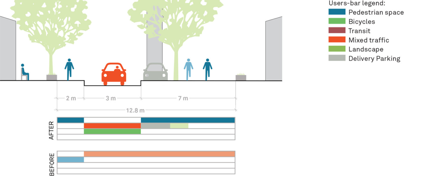 The street design project includes a pedestrian promenade, improvements to existing public spaces, and a new park. The redesign aims to strengthen the role of the street by recognizing its nature as a pedestrian axis and by strengthening the businesses located along it.