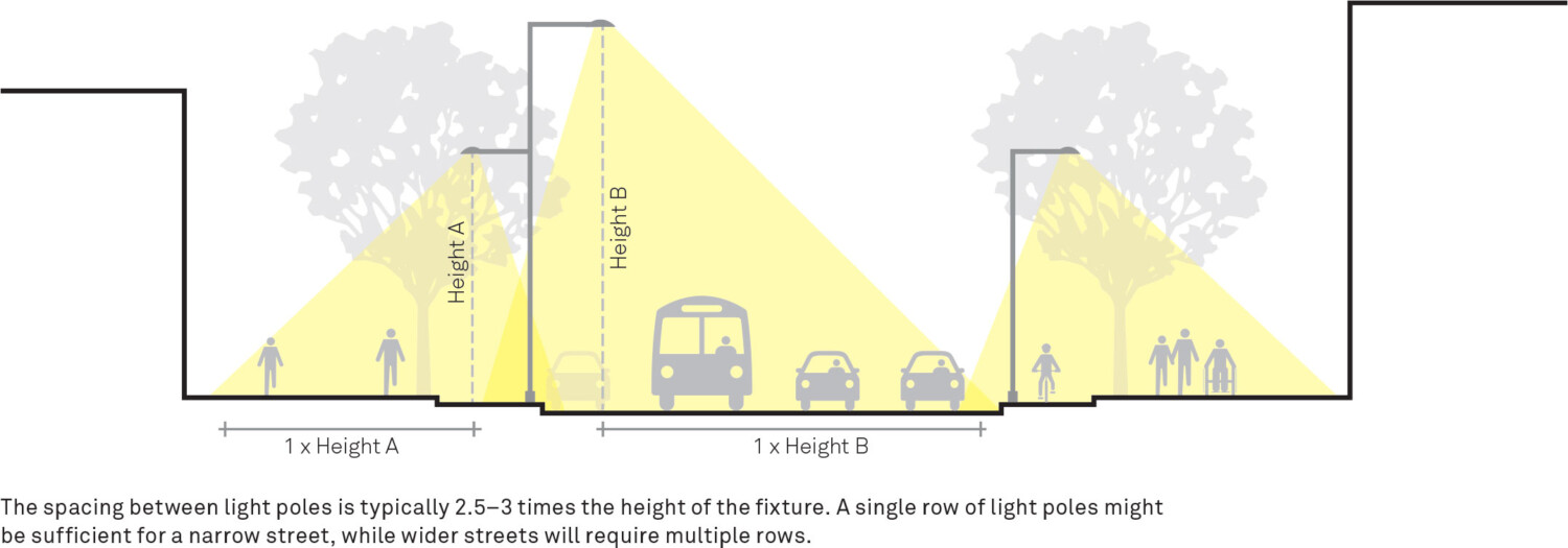 Space light fixtures to provide uniform distribution and illumination of roadways and sidewalks. Consider the locations of obstruction such as trees or billboards.
