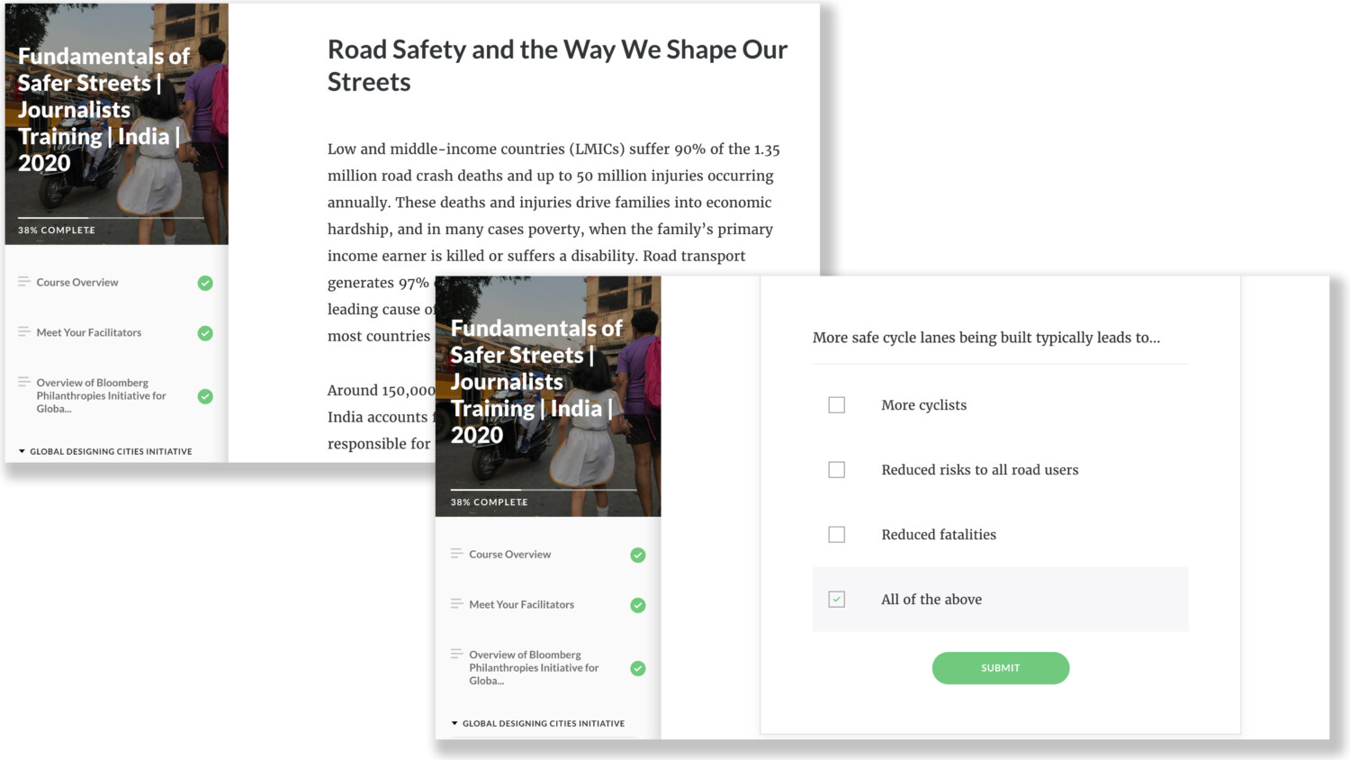Supported by the Bloomberg Philanthropies Initiative for Global Road Safety (BIGRS)—which has dedicated $259 million over 12 years to implement interventions that have been proven to reduce road traffic fatalities and injuries in low- and middle-income countries—this course is designed to equip journalists with industry-specific vocabulary, global and local best practices, and relevant data sets that will help them communicate more effectively around issues of road safety, infrastructure needs, and related activities and interventions.