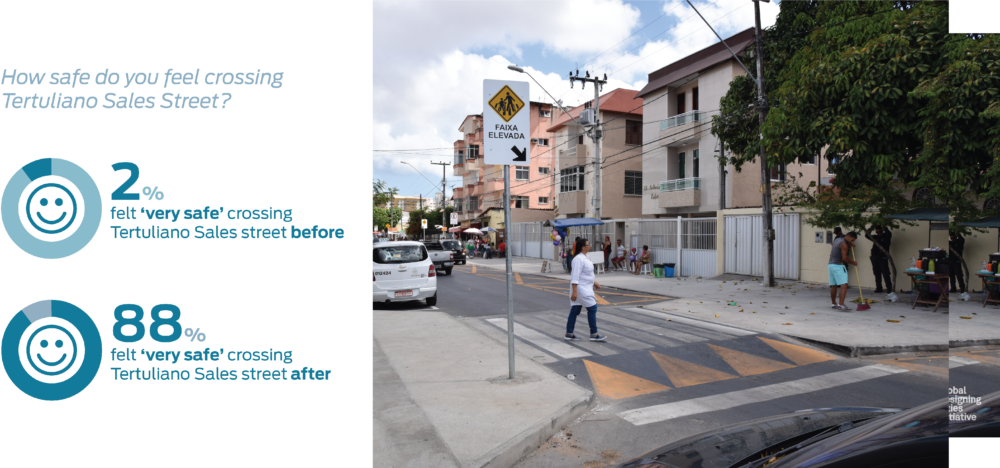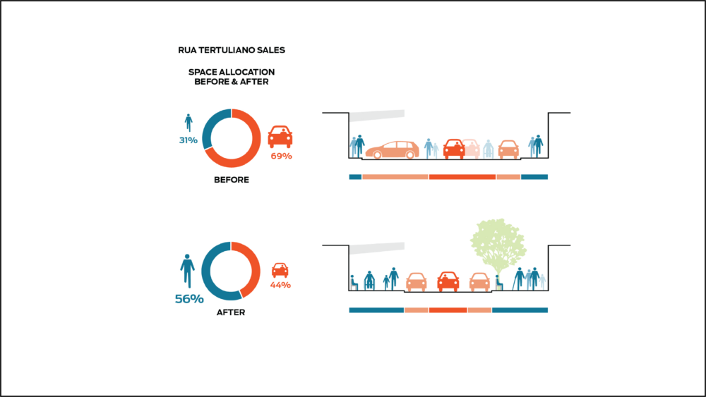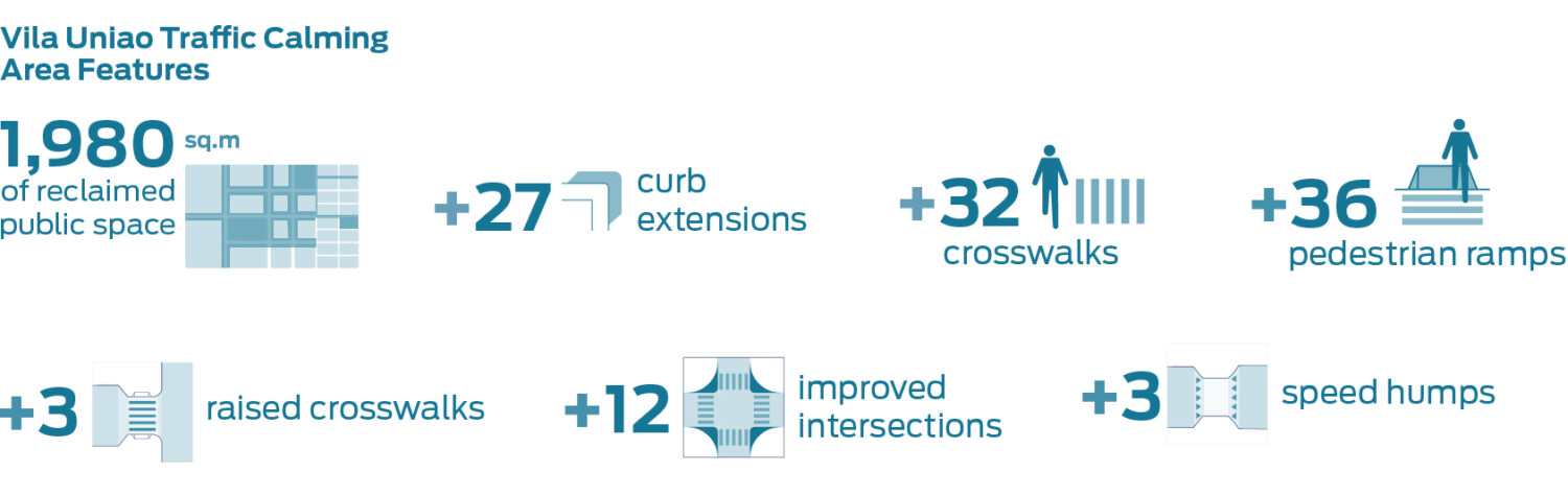 The results so far are positive. Speed measurements have shown up to a 42% drop in average speeds, reducing the risk and severity of crashes. Conditions for pedestrians also improved immensely: on Tertuliano Sales, the number of pedestrians walking on the roadbed dropped by 86%. And most importantly, during the counts, no children were observed walking or being carried on the roadbed near the facility.