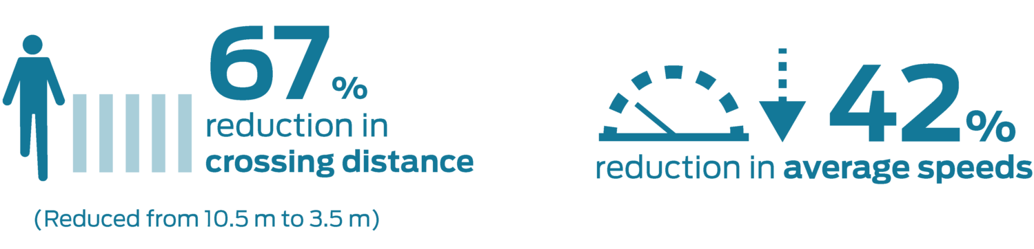 Shorter crossing distances enhance visibility significantly and reduce pedestrian exposure to motorized traffic.