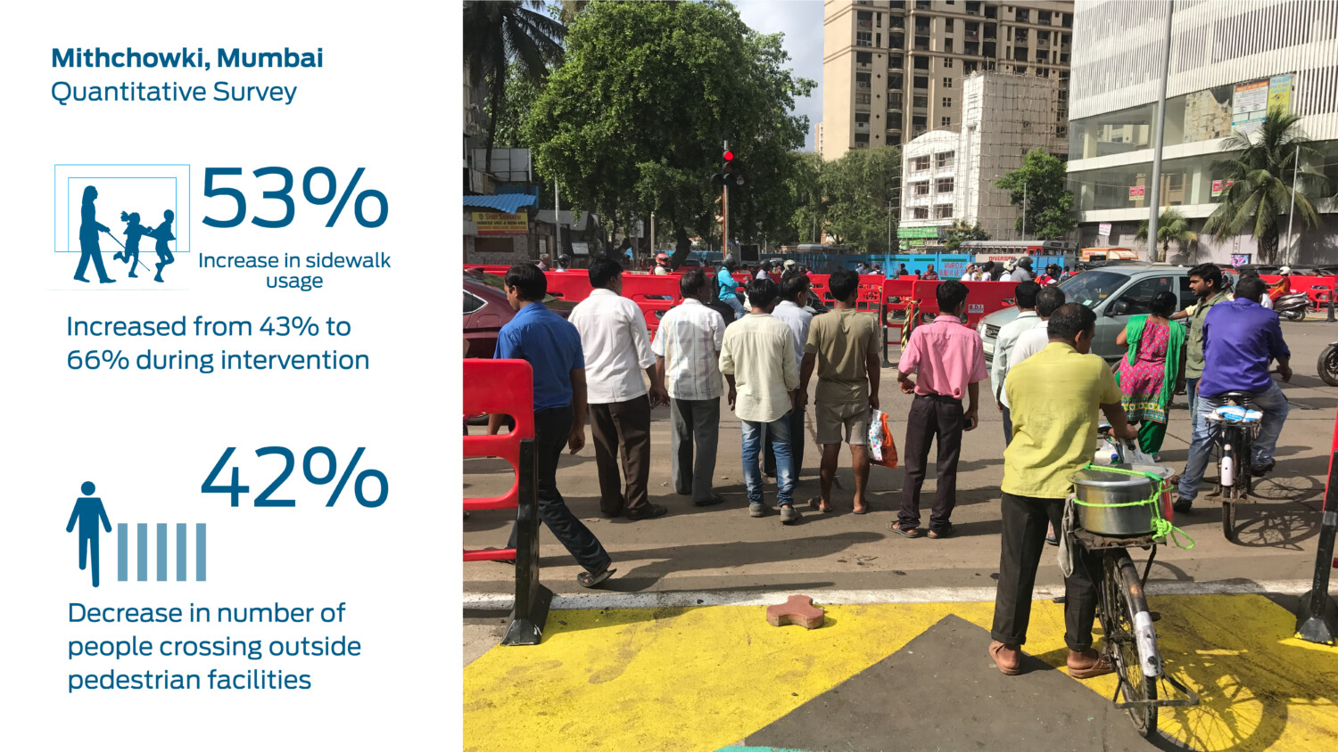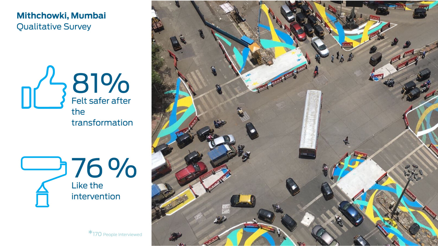 Brief data collection exercises before and after the transformation helped evaluate the project and were collected in collaboration with students from KRVIA – Kamla Raheja Vidyanidhi Institute for Architecture. User surveys on all data collection days further provided an insight from the local people to understand their perspective of how safe or vulnerable they feel while using the space, and how they would see it change. 81% of the pedestrians felt safer at the transformed intersection while 76% of the people preferred the transformation.
