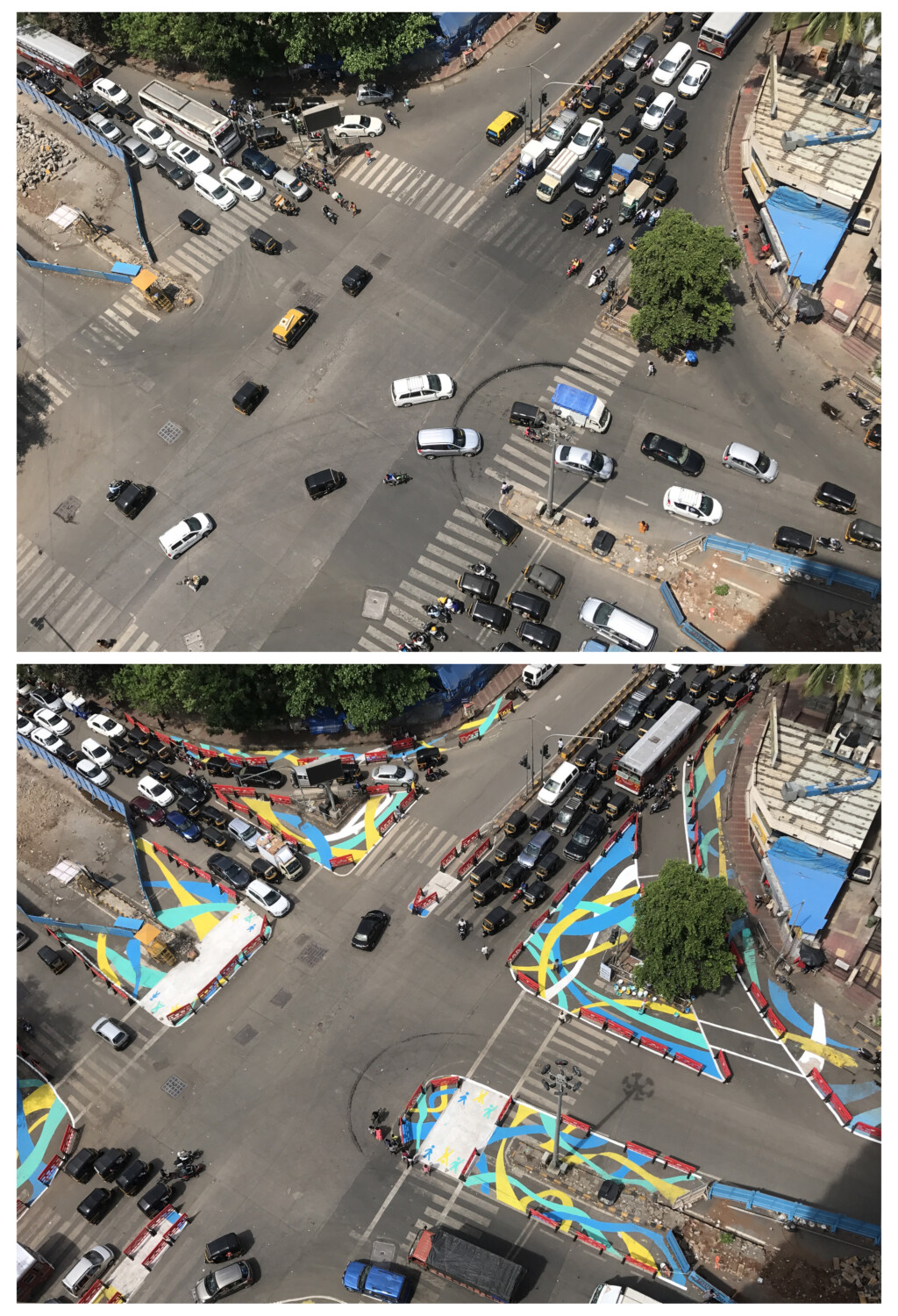 As we approach the 2018 Road Safety Week in Mumbai, India, we decided to revisit GDCI’s collaboration with MCGM and MTP from last year, where a week-long trial and Mithchowki in Malad, was conducted to reclaim ~1650 sq.m of underutilized roadbed on the street for pedestrians and support a space that is more legible for all users. Through narrowing free turning lanes and tightening corner radii to reduce speeding vehicles, and widening pedestrian sidewalks, approximately 27% of the intersection area was redistributed to support safer movements for all road users. Striking strokes of bright blue, green, and yellow fill in these curb-extensions alongside the wider and direct crosswalks and new refuge areas. These evidence-based strategies are proven to reduce the risk of exposure of pedestrians to moving vehicles by giving them safer spaces to wait and shorter distances to cross.