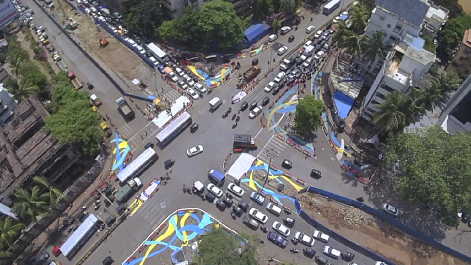 The demonstration served as a critical tool to trial and evaluate design strategies that helped address the intersection’s increasing road safety risks due to growing vehicular volumes and pedestrian movements due to the incoming metro. The temporary artwork was completed in collaboration with KRVIA, and conceptually represents the direction, path, and volumes of pedestrians moving on the roadbed before the intervention. The interim intervention was planned to refine longer-term design strategies for the local context and to inform future design and construction of street projects around Mumbai.