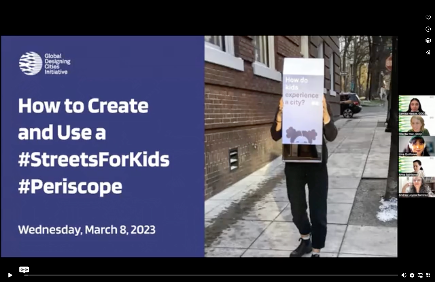 During this hour-long discussion, the Streets for Kids team delved into the resources available to create and build a reverse periscope. GDCI staff opened with an overview of the need to design streets with children’s perspectives in mind and reviewed the resources available to build and use the reverse periscope. Then, they were joined by Lina Quiñones of Despacio, a Bogotá-based NGO working to improve the quality of life for people of different ages in cities, and Andrea Loyola, the co-founder, and director of operations at the Lima-based ANIDARE organization that combines architecture and education to focus on people and early childhood. Both guest speakers shared their experiences using the reverse pericope in their city streets.